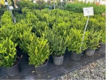 Green Mountain Boxwood is a compact, evergreen shrub with dense, dark green foliage, perfect for hedges. It thrives in sun to partial shade and requires minimal maintenance.
